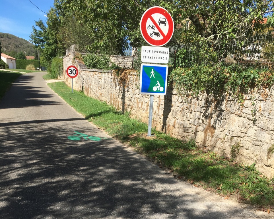 Dès ce carrefour (Km 0). on est sur la Voie Verte interdite à tous véhicules à moteurs sauf riverains, de grands panneaux l’indiquent, et la vitesse est limitée à 30km/h. Des pictogrammes vélo de couleur verte jalonnent le parcours, ainsi que des panonceaux « VéLot ».