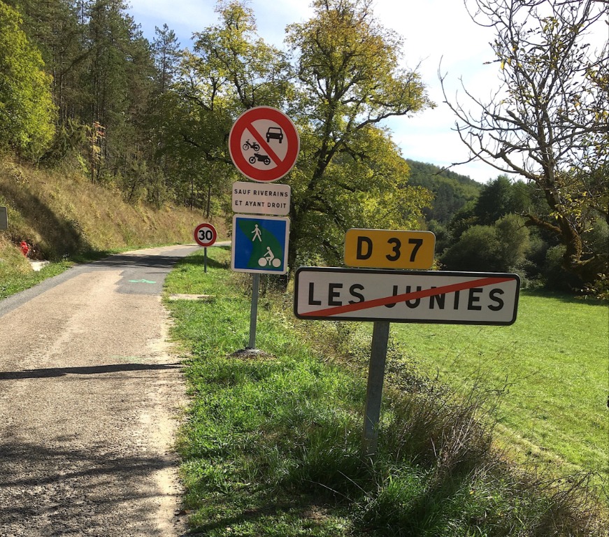 On continue et arrive au centre de Les Junies, au carrefour avec la rue de la Cale qui arrive de la D45 (Km 3,3).
