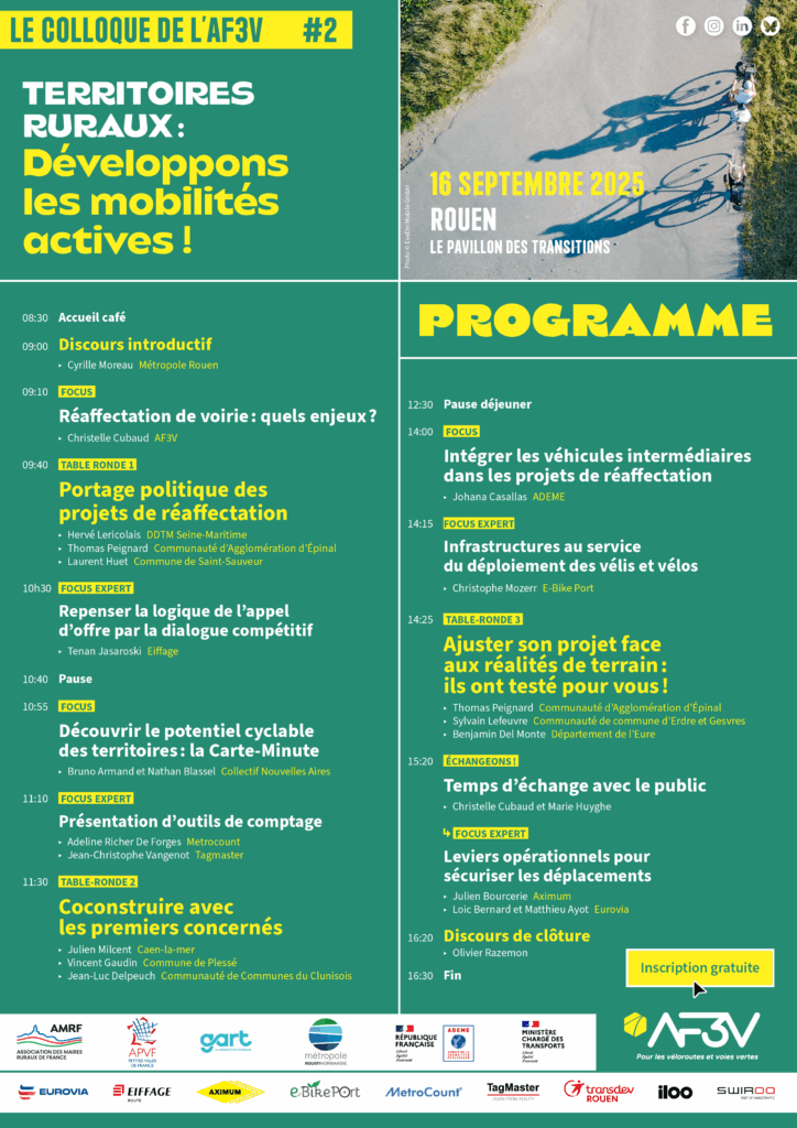 L’AF3V organise le mardi 16 septembre 2025 au Pavillon des Transitions à Rouen un colloque sur le développement des mobilités actives en territoire rural. S’appuyant sur des retours d’expériences de projets de requalification/réaffectation des voies peu circulées à destination des mobilités actives, la journée se propose d’explorer des pistes d’action concrètes pour engager des démarches similaires.