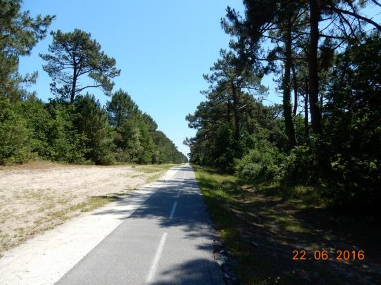 La Véloroute du Littoral Atlantique (EV1 Vélodyssée) est une belle Voie Verte, réalisée en enrobé lisse, et qui longe la côte, à un ou deux kilomètres de l’Océan, à l’arrière de la première rangée de dunes, en pleine forêt.