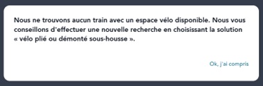 Par ailleurs si l’on coche l’option « vélo » sur le train Nantes Rennes, SNCF Connect ne trouve pas de trains pourvus de places vélos !?
