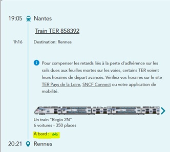 Dans l’exemple ci-dessous un TER « Rennes Nantes » mentionne bien un espace vélo gratuit. Alors qu’un TER « Nantes Rennes » ne mentionne pas d’espace vélo gratuit
