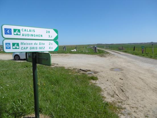 En sortie de Wissant, on est de nouveau pour 2 km sur la RD940, sans surlargeur, cette fois. Puis une portion est aménagée en parallèle. Après, chemin partagé. De jolies vues, mais la mer est assez loin. Fin de signalisation à Haute-Escalles. Après un peu de flottement, on retrouve à la sortie du village une petite route interdite à la circulation motorisée. Mais on passe malheureusement à l’écart du célèbre belvédère du Cap, perché à 150 mètres au-dessus du niveau de la mer et qui offre un point de vue magnifique sur le détroit. Un chemin semble y mener, mais pas sûr que tous les cyclistes fassent ce détour, après des montées importantes. Il faudrait améliorer cela.