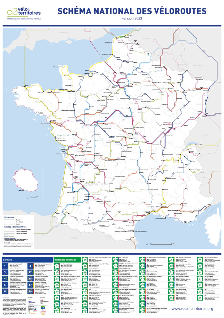 | EuroVelo : l’Europe à portée de roues de vélo Piloté par la fédération européenne des cyclistes (ECF) le schéma européen des EuroVelo retient 16 grands itinéraires européens dont 10 concernent la France avec près de 8 915 km, réalisés à 92 % au 01/01/2020. |