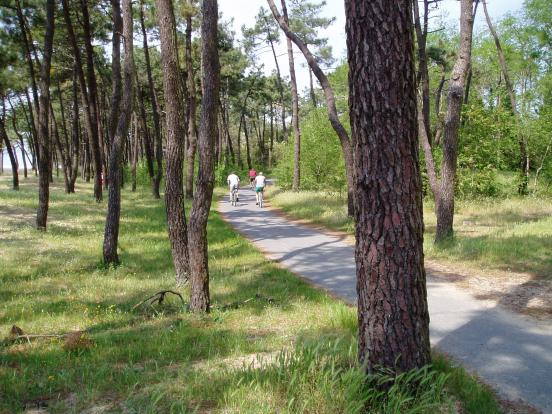 Vous rejoignez ensuite la piste cyclable de bord de mer, parallèle au sentier pédestre, et qui longe la plage de La Palmyre. Attention, après 1,4 km, quittez la plage car la piste conduit au centre du Club-Méditerranée où elle s’achève en cul-de-sac : prenez à gauche (panneau piste cyclable), la piste qui remonte sous les bois jusqu’à l’entré du Club-Méd.