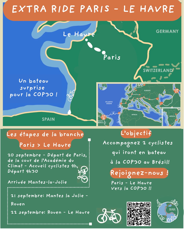 - Départ de Paris le 20 sept, accueil cyclistes 9h, départ 9h30 depuis l’Académie du climat 📅