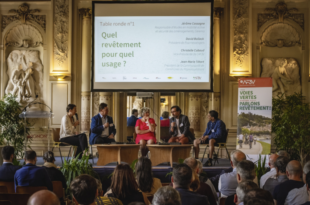 Et un grand merci à l’ensemble des intervenants qui ont rendu cette journée passionnante : Fabrice Tocabens qui a représenté madame Cécile Helle, Maire d’Avignon ; Jean-Marie Tétart, Président de la Communauté de Communes du Pays Houdanais ;David Bollack Président de Popmessengers entreprise de livraison à vélo ; Jérôme Cassagnes du CEREMA ; Christelle Cubaud, notre Vice-Présidente ;Geneviève Laferrère de France Nature Environnement qui a présenté de manière remarquable notre guide sur les revêtements voies vertes (n’hésitez pas à nous le demander) ; Maria Chedeville-Jebli Présidente de Mai à Vélo ; Luc Berman du Club des villes et territoires cyclables et Marchables ; Pauline Magnière de la Ville à Vélo (Lyon ; Jean-Guy Gayet, Président de SOLIDEV (Drôme) ;Thomas Rosset de Praxie-Design ; Olivier Marquet directeur « Mobilité » de la ville d’Avignon ;Simon Pouget, directeur Recherche & Innovation chez Eiffage-route ; Julien Bourcerie directeur Mobilité active chez Colas ; Julien Bourcerie ; Damien Derouet, chargé de projet véloroutes et voies vertes à la Région Auvergne Rhône-Alpes ; Damien Derouet Jacqueline Markovic, vice-Président de Vélo & Territoires, Bertrand Jacopin, directeur Etudes et travaux au Syndicat mixte d’Aménagement de la Vallée de la Durance ; Camille Perretta de BL Evolution .