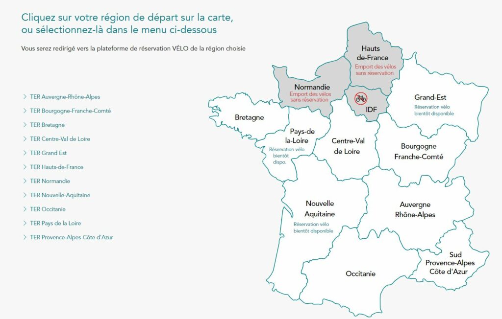 A ce jour, les régions Grand Est, Pays de Loire et Nouvelle Aquitaine, n’ont pas encore mis en place leur système de réservation de places vélos. Par ailleurs la Normandie renonce cette année à la réservation vélo.