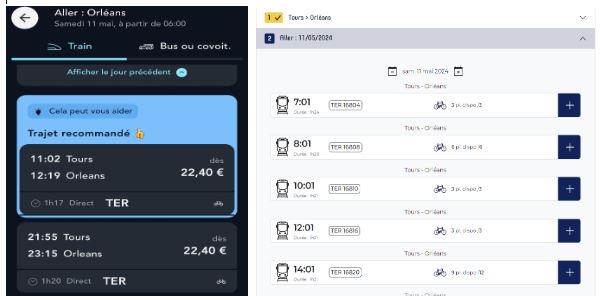 Si l’on ajoute un vélo sur SNCF Connect, par exemple le samedi 11 mai entre Tours et Orléans,