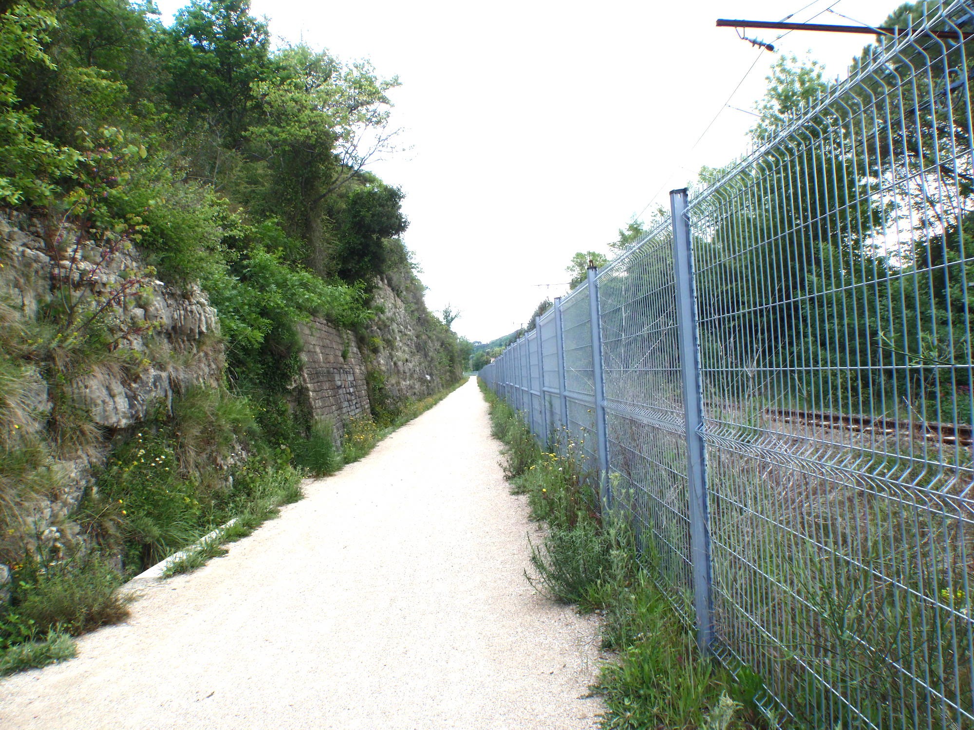 La Voie Verte descend à flanc de montagne, bordée de végétation méditerranéenne : chênes verts, yeuses, cistes, et grandes bruyères à fleurs blanches. On domine la vallée encaissée, et suit d’abord la route. Puis la voie s’en éloigne, et se rapproche de la rivière (calme).
