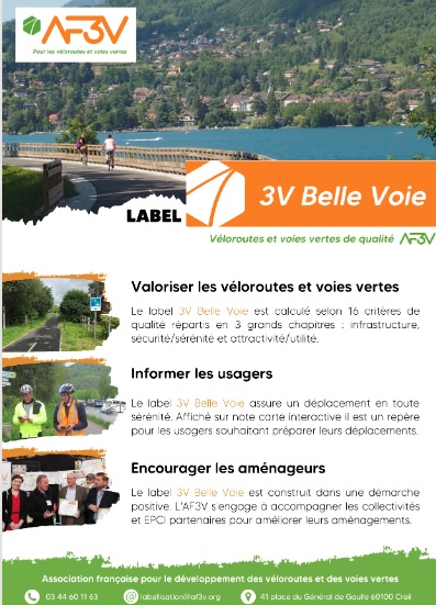 "3V Belle Voie" valorise les véloroutes et voies vertes de qualité en s'appuyant sur 16 critères répartis en 3 grands chapitres : l'infrastructure (le revêtement par exemple), la sécurité/sérénité (largeur des voies par exemple) et l'attractivité/l'utilité (desserte de gare par exemple).
