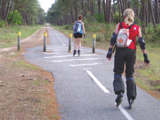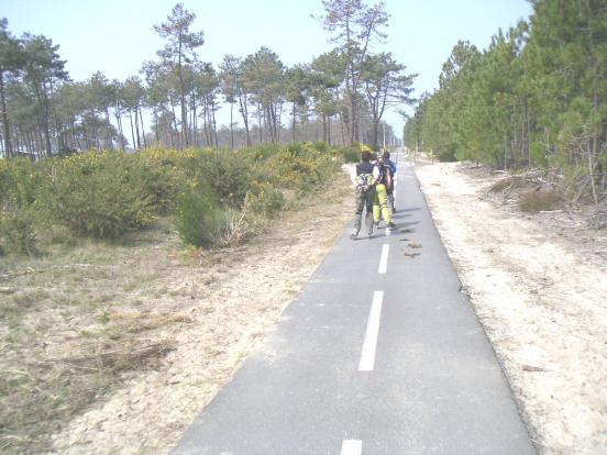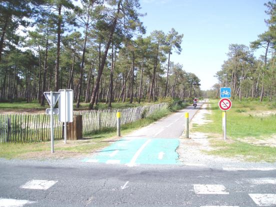 La Véloroute du Littoral Atlantique (EV1 Vélodyssée) est une belle Voie Verte, réalisée en enrobé lisse, et qui longe la côte, à un ou deux kilomètres de l’Océan, à l’arrière de la première rangée de dunes, en pleine forêt.