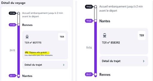 Dans l’exemple ci-dessous un TER « Rennes Nantes » mentionne bien un espace vélo gratuit. Alors qu’un TER « Nantes Rennes » ne mentionne pas d’espace vélo gratuit
