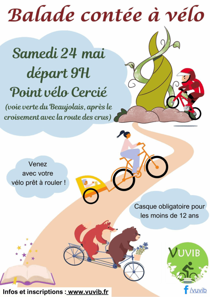 Venez pédaler au rythme des contes ! L’association VUViB de Belleville vous invite à une balade contée en vélo au départ du point vélo de Cercié à 9h00.