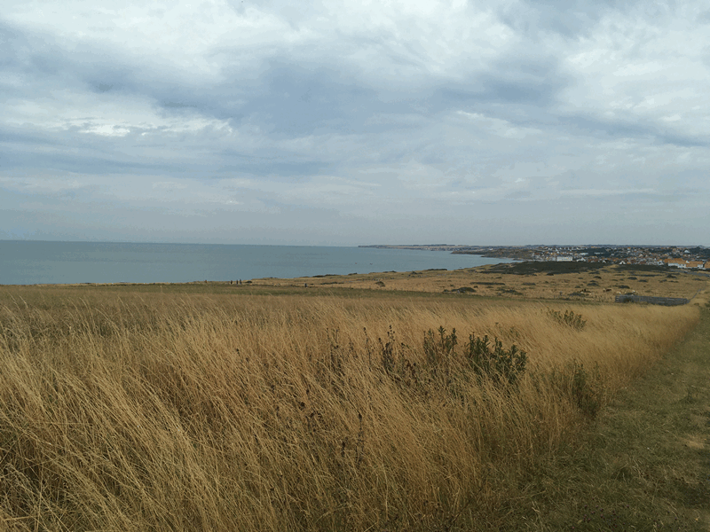 En sortie de Wissant, on est de nouveau pour 2 km sur la RD940, sans surlargeur, cette fois. Puis une portion est aménagée en parallèle. Après, chemin partagé. De jolies vues, mais la mer est assez loin. Fin de signalisation à Haute-Escalles. Après un peu de flottement, on retrouve à la sortie du village une petite route interdite à la circulation motorisée. Mais on passe malheureusement à l’écart du célèbre belvédère du Cap, perché à 150 mètres au-dessus du niveau de la mer et qui offre un point de vue magnifique sur le détroit. Un chemin semble y mener, mais pas sûr que tous les cyclistes fassent ce détour, après des montées importantes. Il faudrait améliorer cela.