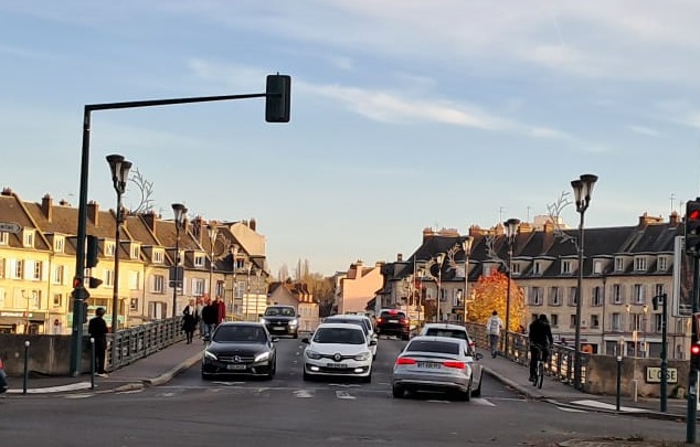 Elle se fait sur un pont avec 3 files de circulation automobile et la plupart des vélos et trottinettes roulent sur les trottoirs par peur de la circulation automobile.