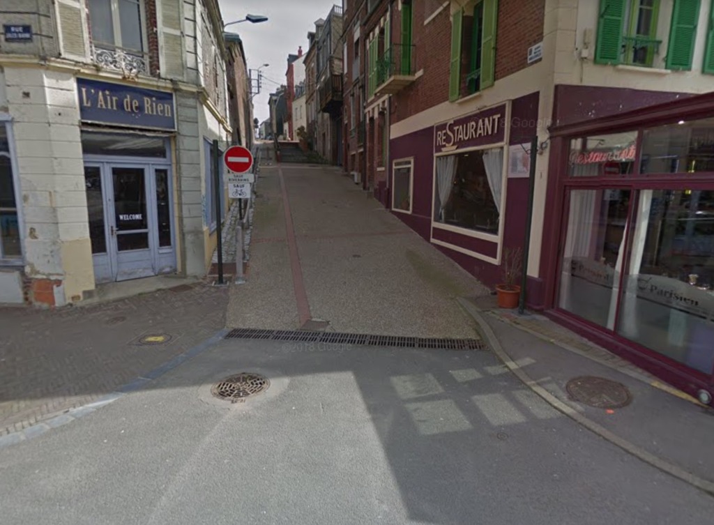 Cela commence avec la Rampe Maurice Holleville, une rue sans circulation motorisée mais présentant une déclivité de plus de 12% sur 50m avec, de plus, une demi-barrière au deux tiers de la montée. On prend un court répit en tournant à gauche dans la rue de l'Eglise (panneau sens interdit + panonceau "Vélo à la main" !!), puis on tourne à gauche Rue Joseph Legad qui offre une très jolie vue sur Le Tréport vers l'arrière, et se prolonge par la Rue de la Falaise.